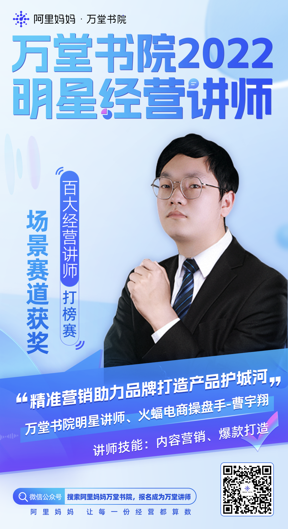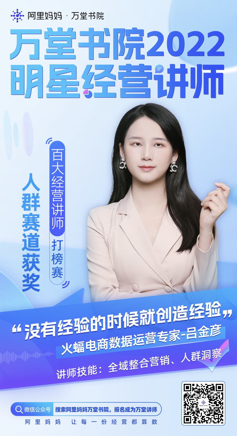 為了服務(wù)更多商家獲得經(jīng)營確定性成長,在天貓雙11期間,阿里媽媽萬堂書院開啟「百大經(jīng)營講師招募令」,設(shè)人群、貨品、場景、行業(yè)四大經(jīng)營賽道,邀請眾多營銷資深從業(yè)者、電商操盤手一起,分享大促期間的數(shù)智化經(jīng)營的策略和實戰(zhàn)方法。