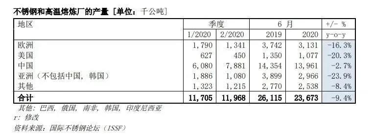 布魯塞爾,2020年9月29日–國際不銹鋼論壇(ISSF)發布了2020年上半年的數據,顯示不銹鋼熔煉車間的產量同比下降9.4%至約2370萬噸。