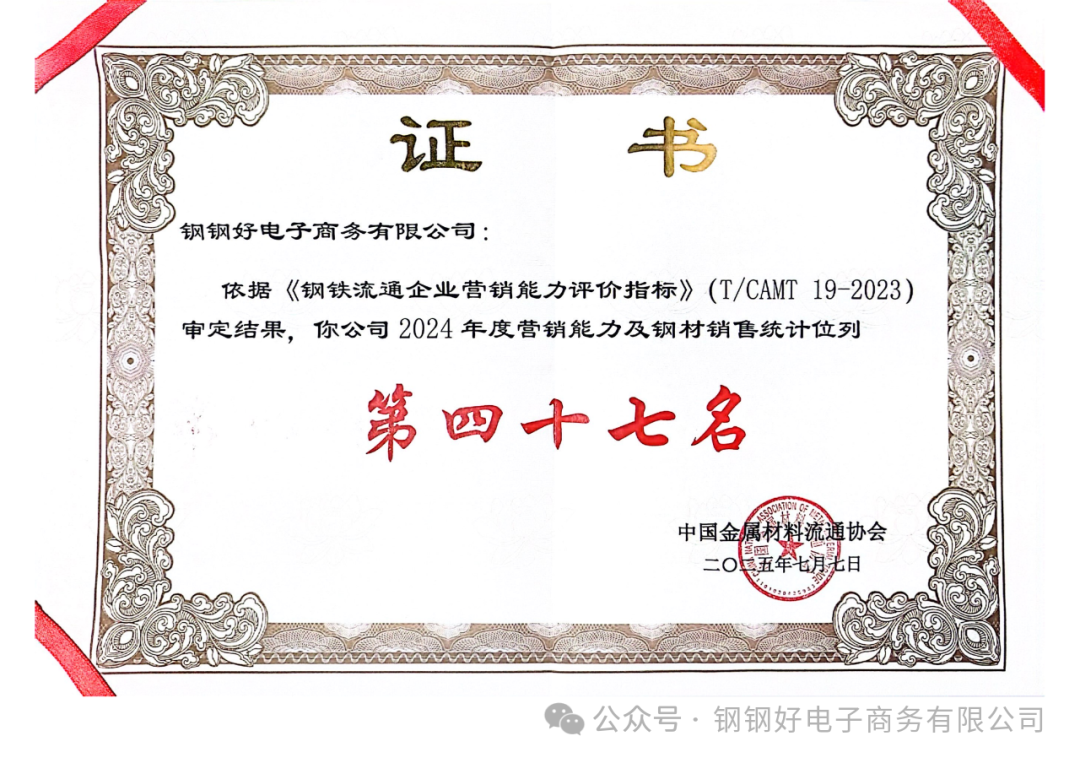 在鋼鐵行業深度調整、供應鏈加速重構的關鍵階段,中國金屬材料流通協會正式通報 2024 年度會員單位營銷能力評價及鋼材銷售統計結果,鋼鋼好一舉斬獲兩項重磅榮譽:獲評 “2024 年度建筑鋼材供應鏈(鋼筋加工配送)優秀企業”,同時在 “2024 年度營銷能力及鋼材銷售統計” 中位列第四十七名,以雙重認可彰顯行業實力!