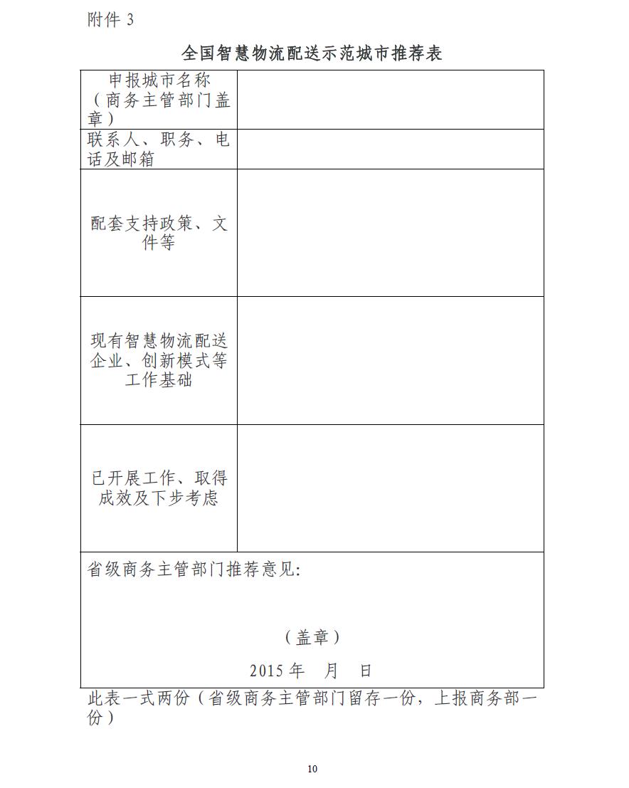 各省級商務主管部門推薦智慧物流配送示范城市(直轄市、計劃單列市可直接申報)、 智慧物流配送示范基地(園區)、智慧物流配送示范企業。